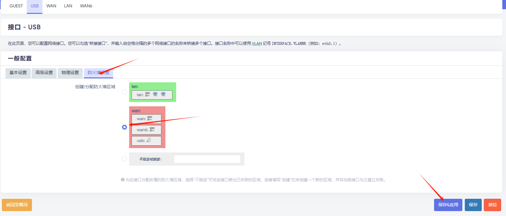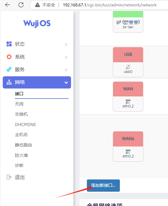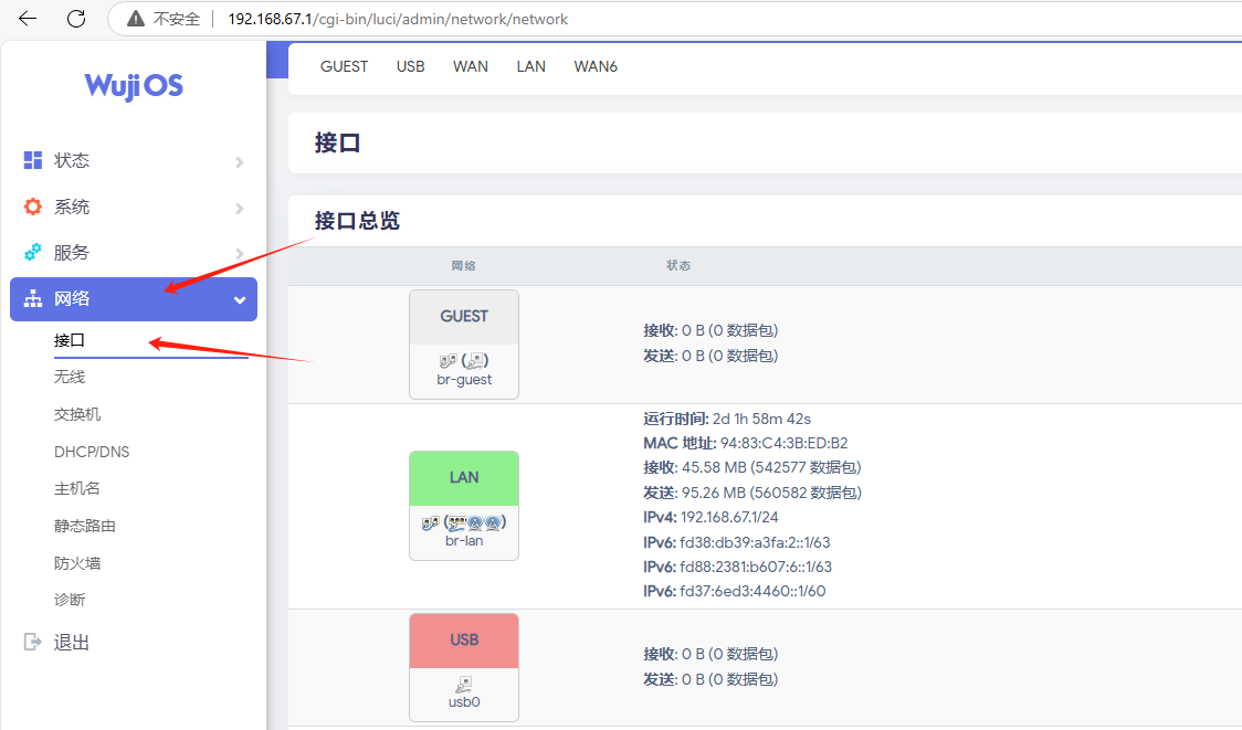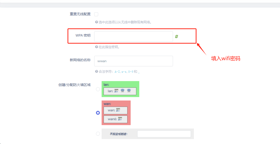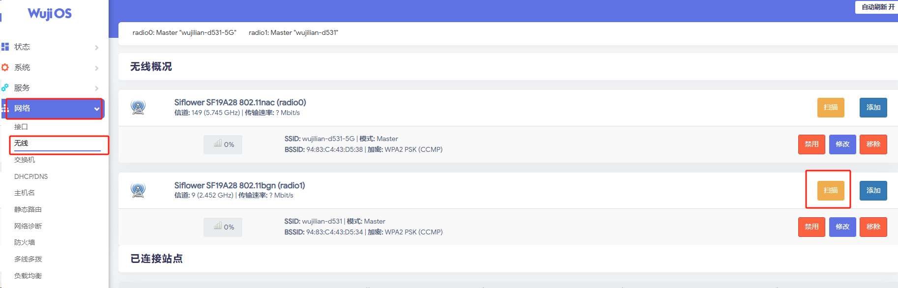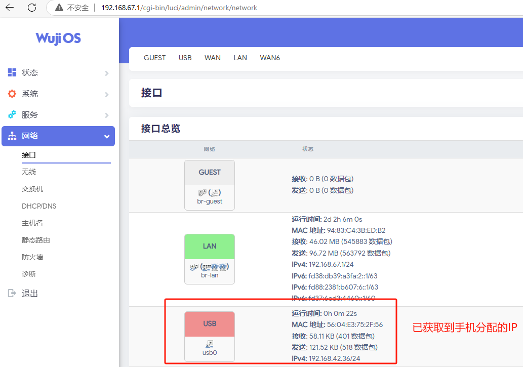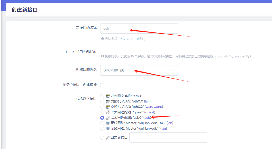 # 安装使用  ## 1、机器接通电源 ## 2、Wan口接入外网网线 外网环境需要保证网线接入后可以正常联网,不需要额外的配置 ## 3、Lan口接入内网设备 ## 4、连接无线 连接无线手机或者笔记本电脑打开无线,找到“Wujilian-XXXX”,并连接,无线密码在设备底部,初始无线密码为wujilian666  ## 5、设置无线桥接模式 无线——扫描。选择桥接的wifi名,填入密码提交后,在高级设置填入接口名称wlan-sta。保存&应用。(重启设备后生效)    ## 6、如何使用手机USB提供网络 手机打开USB网络共享后,通过USB接口连接设备。    点击右下角提交后