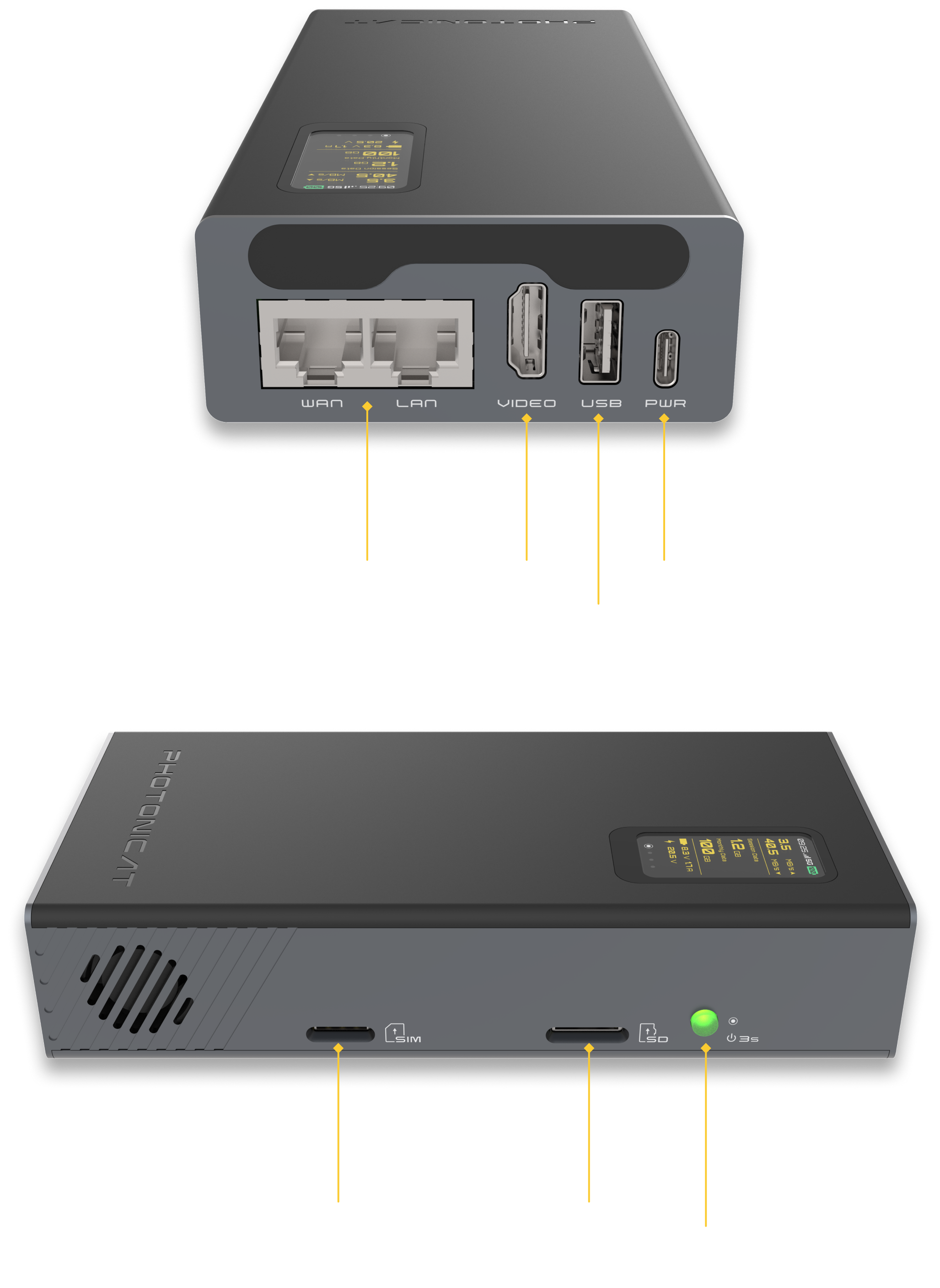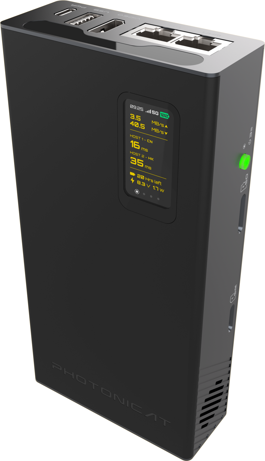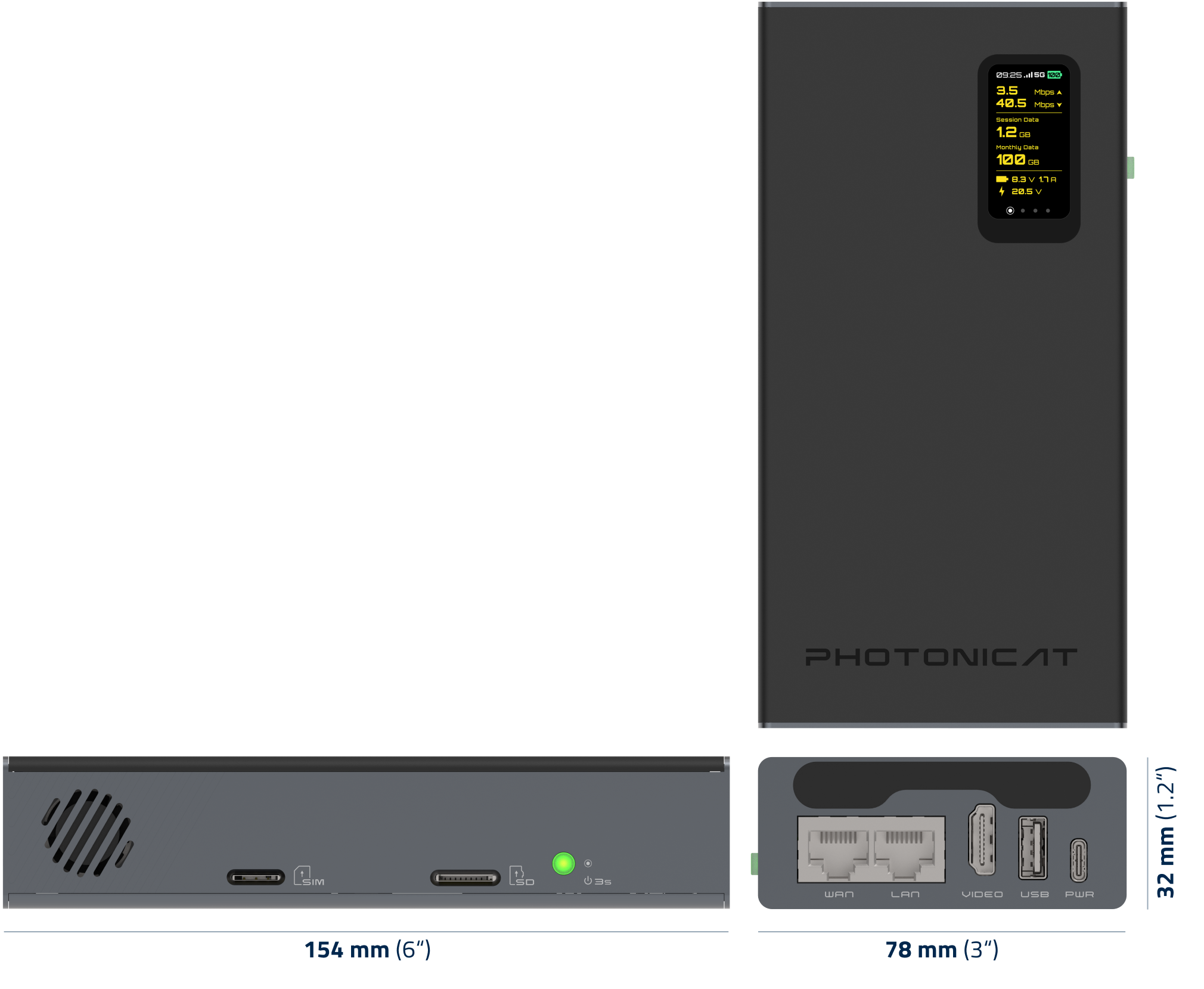 **处理器:**Rockchip RK3568, High performance quad core @ A55,带NPU AI加速器。 **MCU:**Renesas RA2E1 M23 MCU,电源管理 **内存:**板载 1GB LPDDR4 内存和 8GB eMMC I/O端口: 2个 千兆以太网端口 1个 USB3.0 + 1 个 USB-C 端口 1个HDMI端口 1个 SIM 卡插槽 + 1 个 SD 卡插槽 **无线:** Wifi AC + 4G/5G(可选) + 蓝牙 + 其他可扩展模块 **电池:**锂离子充电电池:3.7v 25Wh **输入:**5V 3A **操作系统:**WujiOS **尺寸:**(长)150 x (高)25 x (宽)x 76.5 毫米 **设备外观与尺寸:**